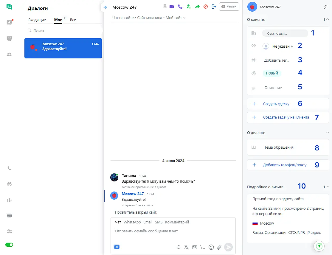 Помимо истории переписки и поля для ввода текста, здесь присутствует информационная панель с данными о клиенте, на которой можно: