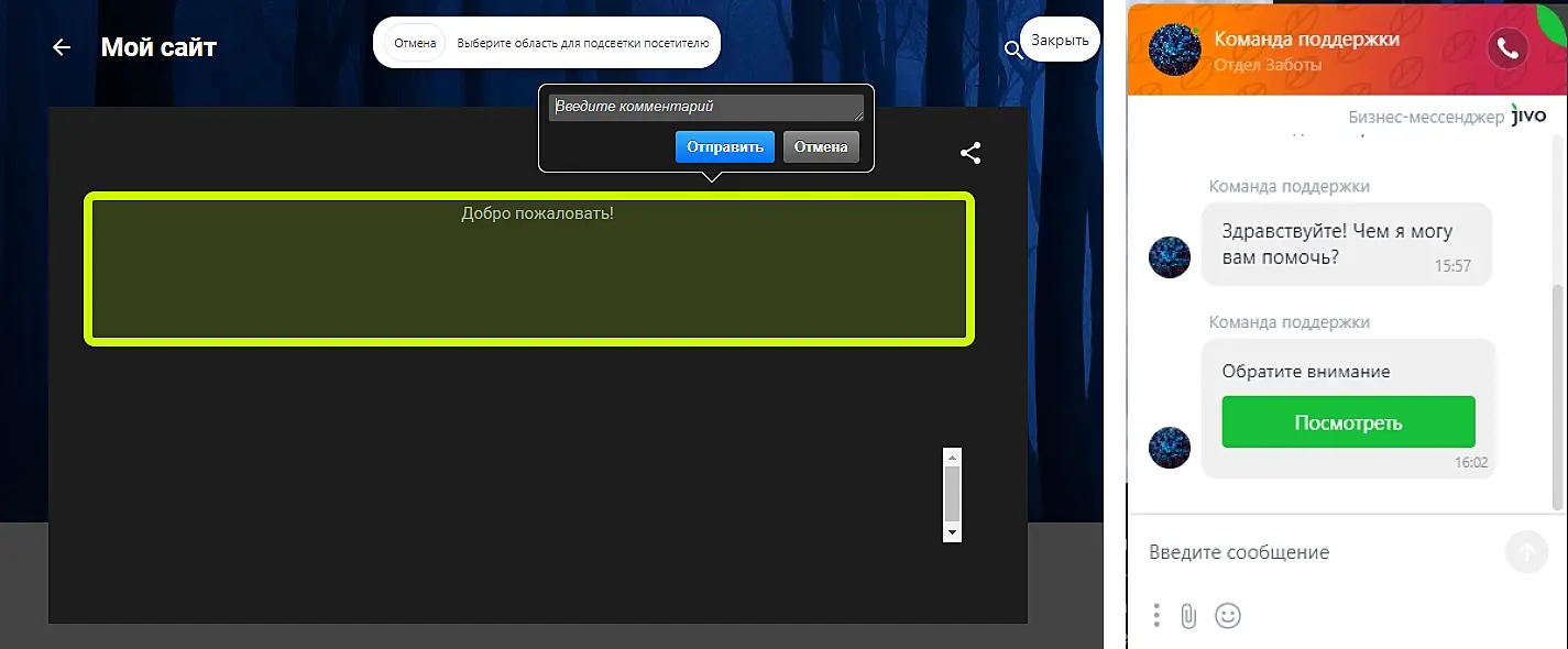При нажатии на значок откроется всплывающее окно. В нем будет отображена страница, на которой сейчас находится посетитель. Вы сможете выделить любую область на этой странице и добавить комментарий.