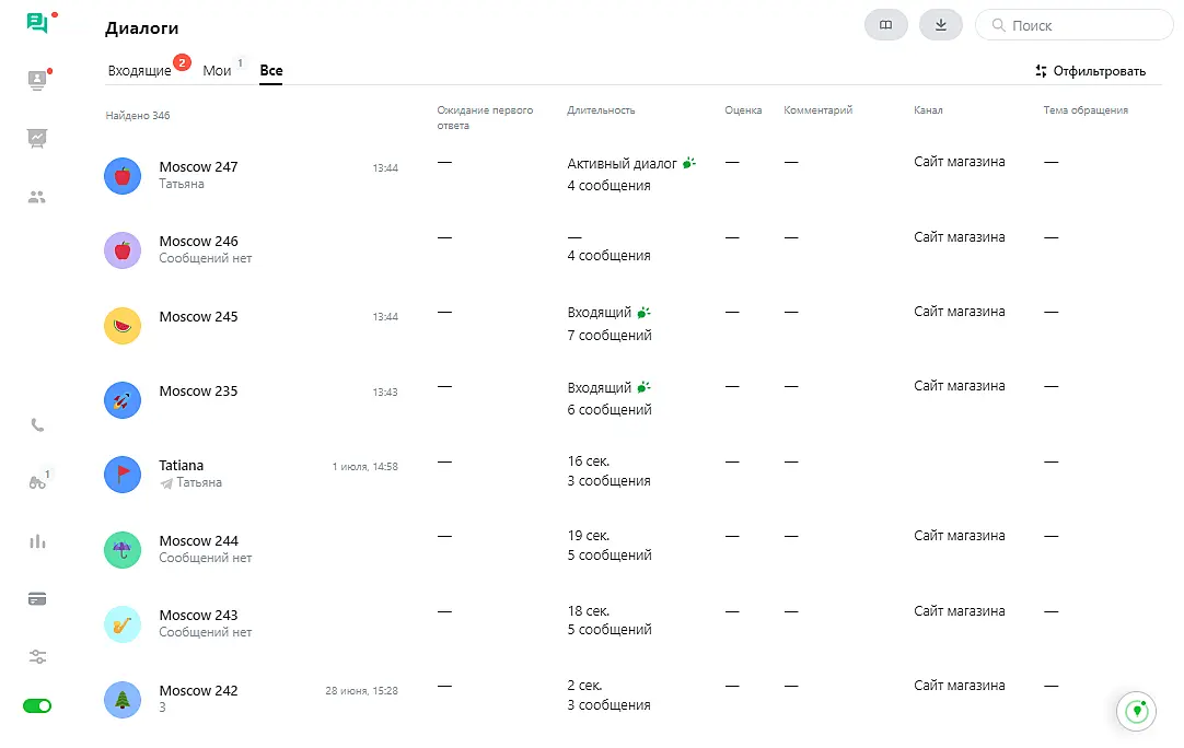 В разделе "Все" отображаются отдельные обращения: от начала диалога со стороны клиента или оператора, до его завершения. Из-за этого вы можете видеть несколько диалогов с одним и тем же посетителем.
