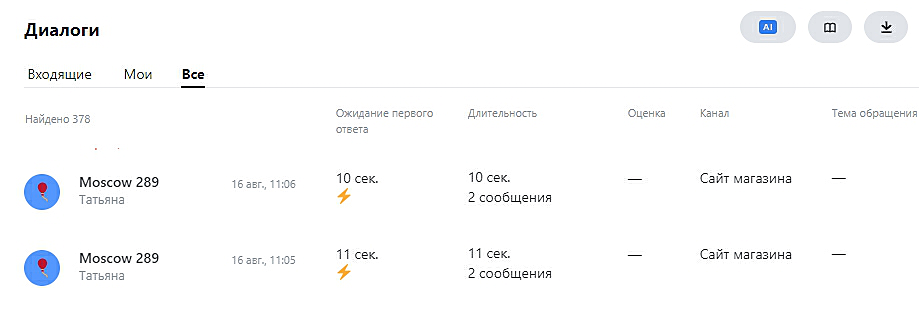 Вкладка "Все" позволяет увидеть завершенные диалоги и краткую статистику по каждому из них.