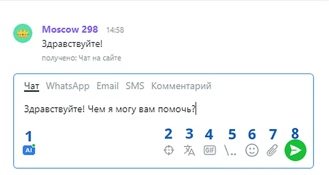 4 - Кнопка GIF позволяет найти и отправить клиенту анимированное изображение.