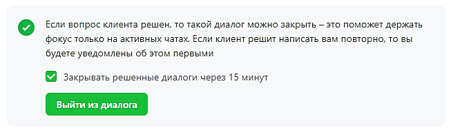 При выборе кнопки "Решен", диалог перенесется в конец списка и станет полупрозрачным. При просмотре такого чата вы увидите системное сообщение. В нем можно поставить галочку "Закрывать решенные диалоги через 15 минут". В таком случае, если не поступит ответа от клиента, чат автоматически завершится.
