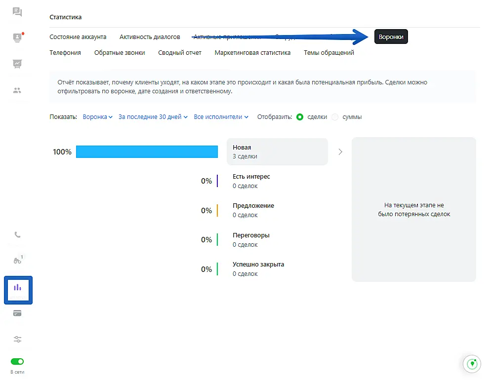 Чтобы посмотреть статистику, перейдите в раздел "Статистика" > "Воронки".