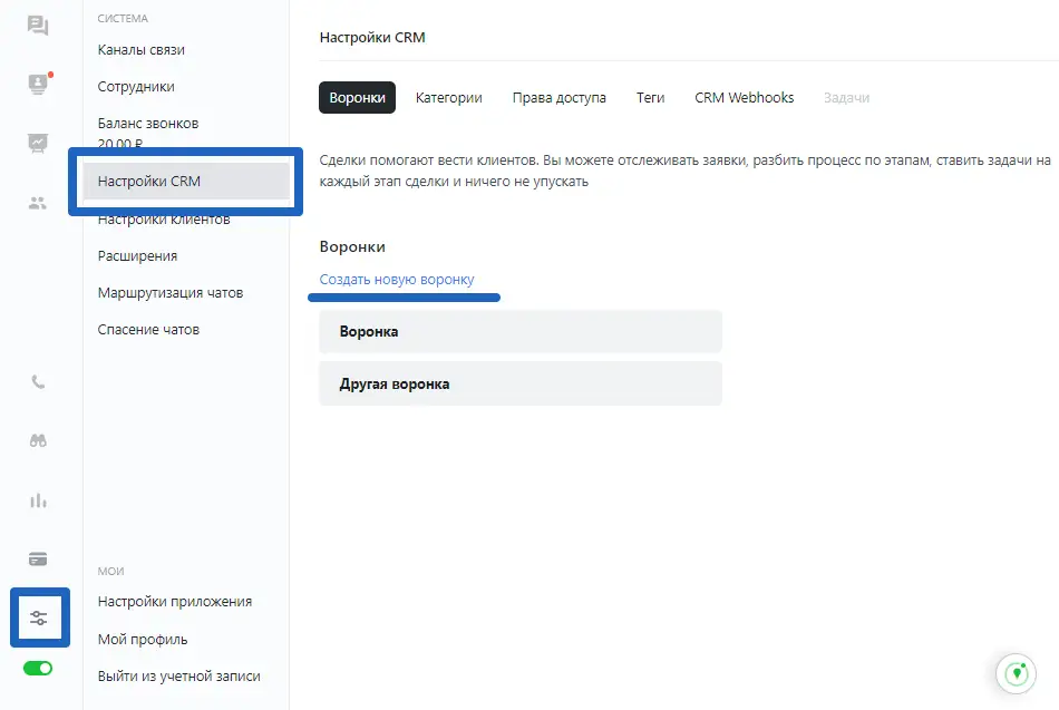 Для создания новой воронки нажмите кнопку "Создать новую воронку".