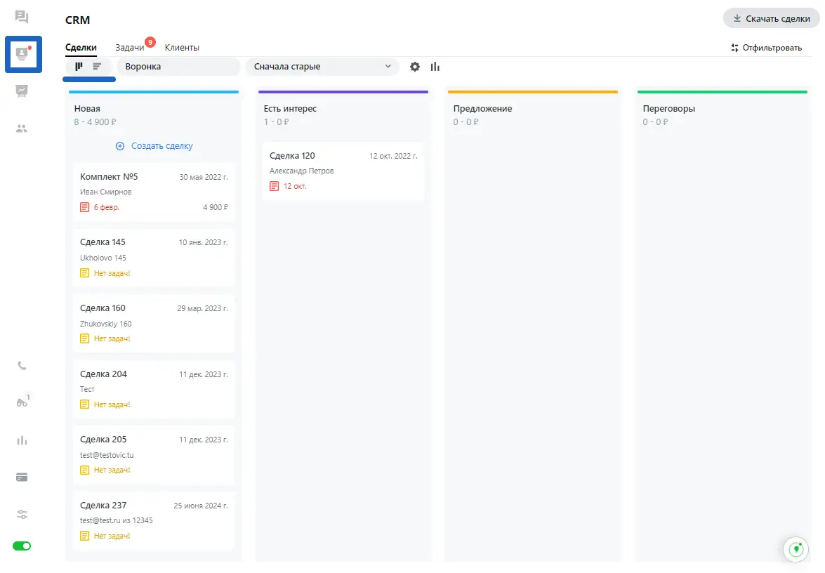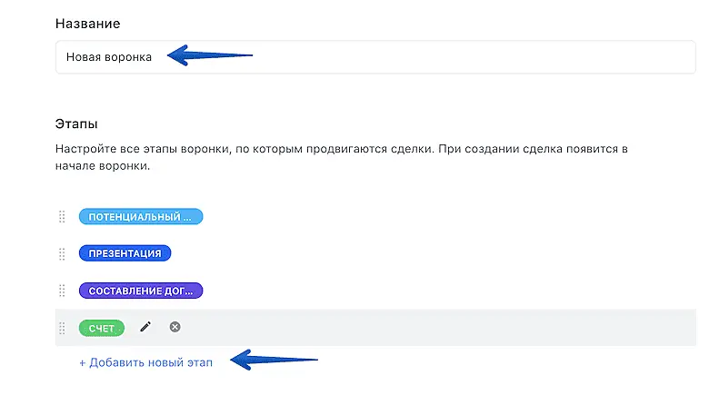 - Если разные товары/услуги требуют особенной организации продаж, создайте отдельные воронки с необходимым набором этапов.