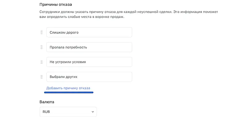 Далее нужно настроить причины при "Отказе", их также можно редактировать, удалять и добавлять.
