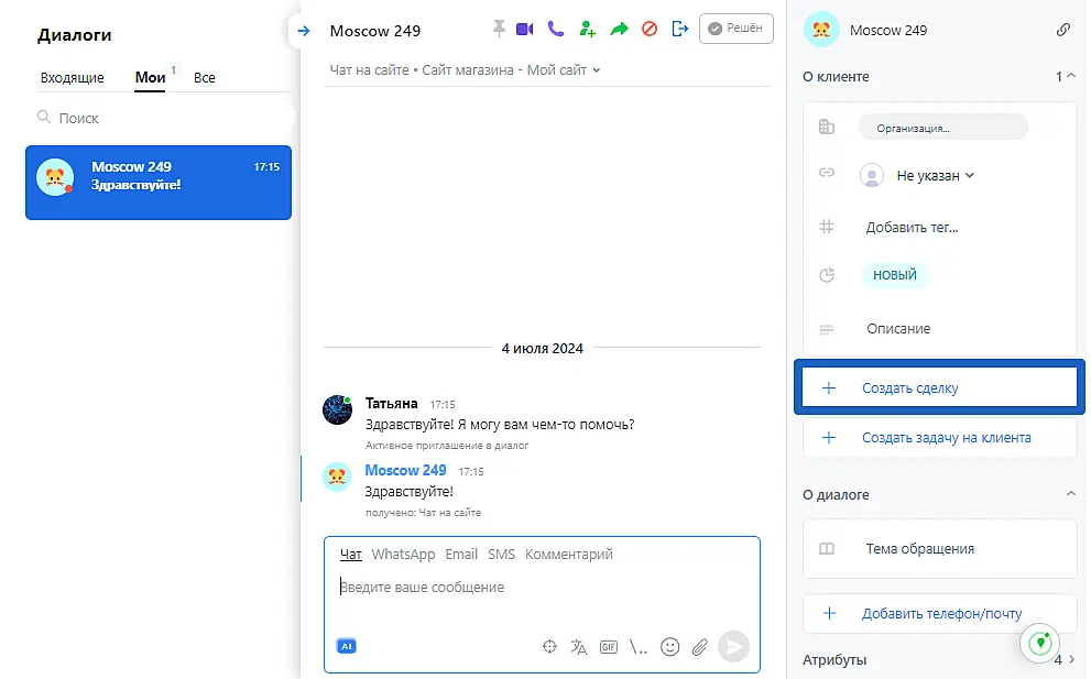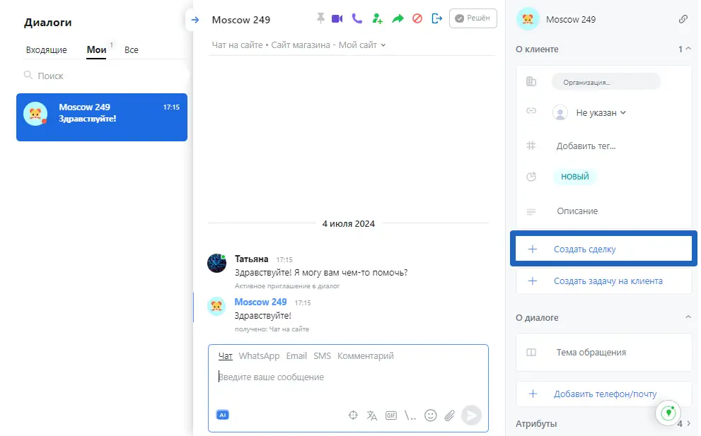 Создать сделку можно прямо из диалога с клиентом. Для этого нажмите "Создать сделку" на панели информации в чате.