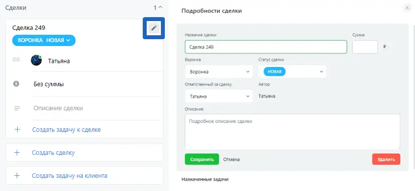 Редактировать сделку также можно прямо в диалоге, нажимая на нужные поля. Если нажать на значок карандаша, откроется отдельное окошко для изменения.