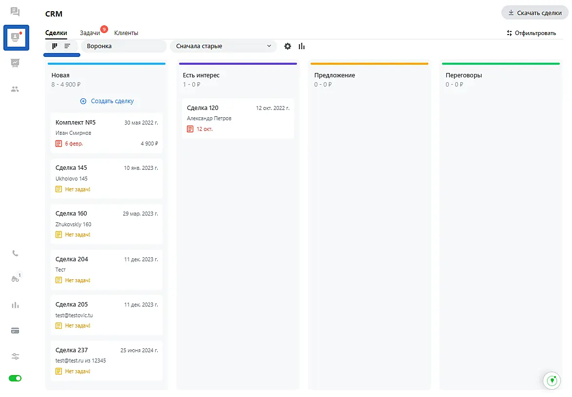 Все добавленные сделки можно увидеть в разделе "CRM" > "Сделки". Их интерфейс доступен в двух видах: канбан и список.