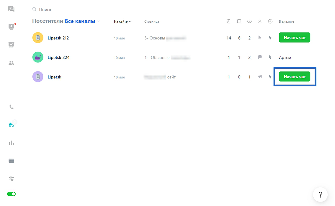 В разделе «Посетители» вы можете вручную начать диалог. Для этого нажмите кнопку «Начать чат» справа от нужного клиента.