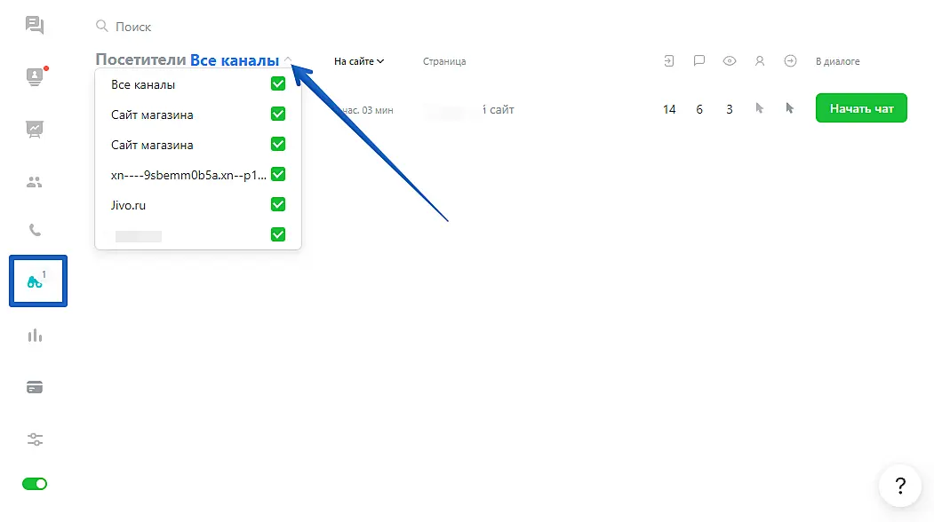Зайдите в раздел «Посетители». По умолчанию в нем отображаются посетители со всех подключенных каналов «Чат для сайта».