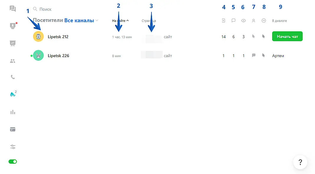 1 - Иконка, имя посетителя и его нумерация в вашем списке клиентов. Если клиент не заполнил имя в форме контактов, будет отображаться его город.