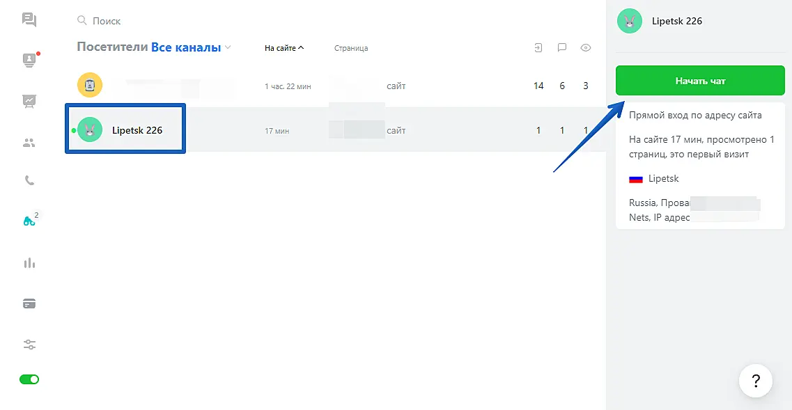 Также вы можете нажать на строчку с именем посетителя, чтобы открылось окошко с информацией о клиенте и о визите. Нажмите в открывшемся окне кнопку «Начать чат», чтобы инициировать общение.