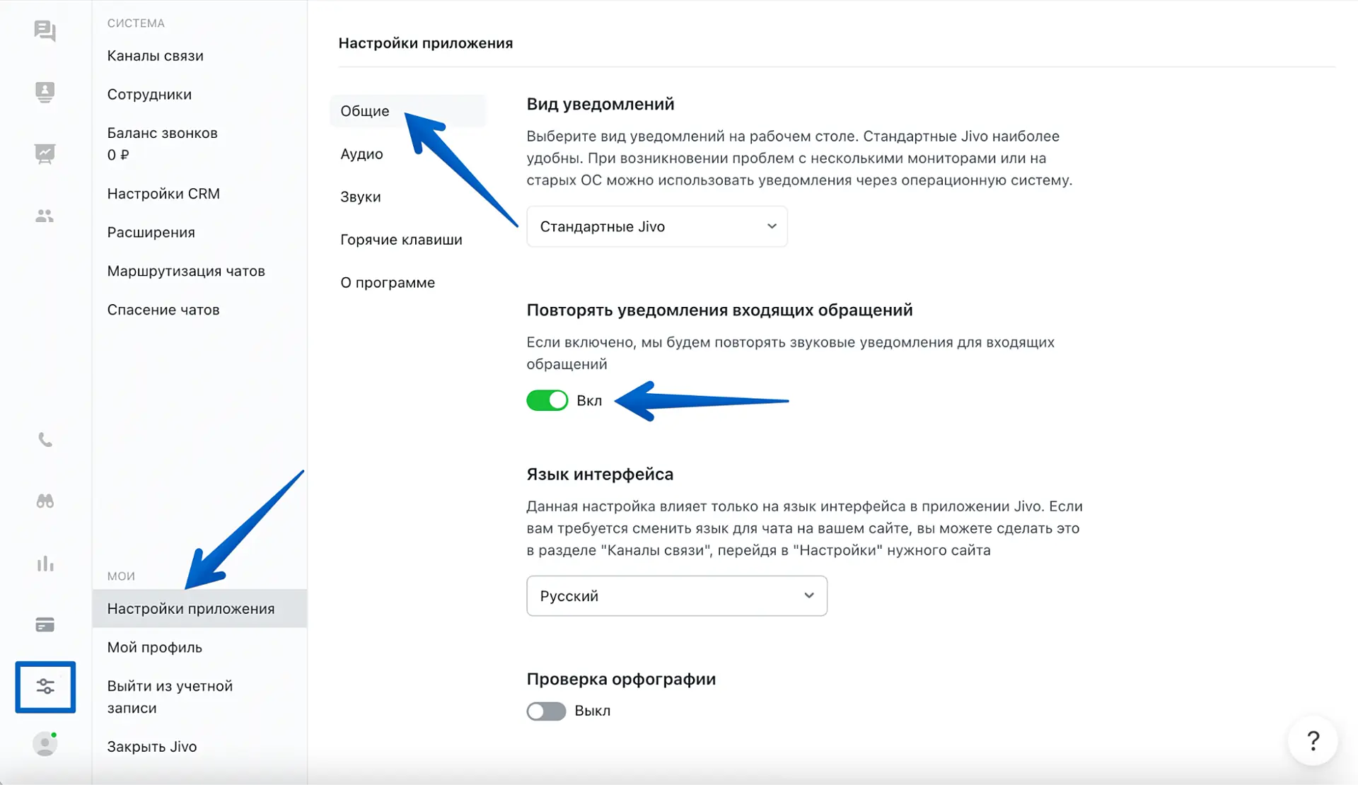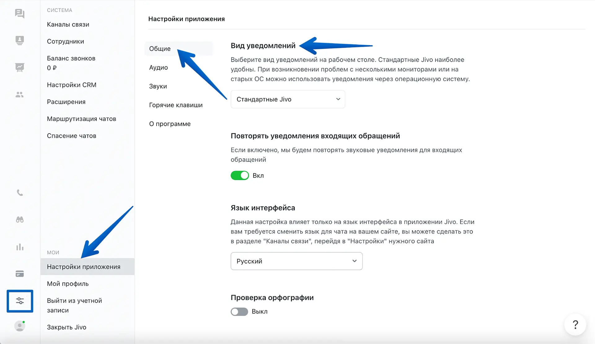 В приложении Jivo перейдите в "Управление" > "Настройки приложения" > "Общие" - "Вид уведомлений".