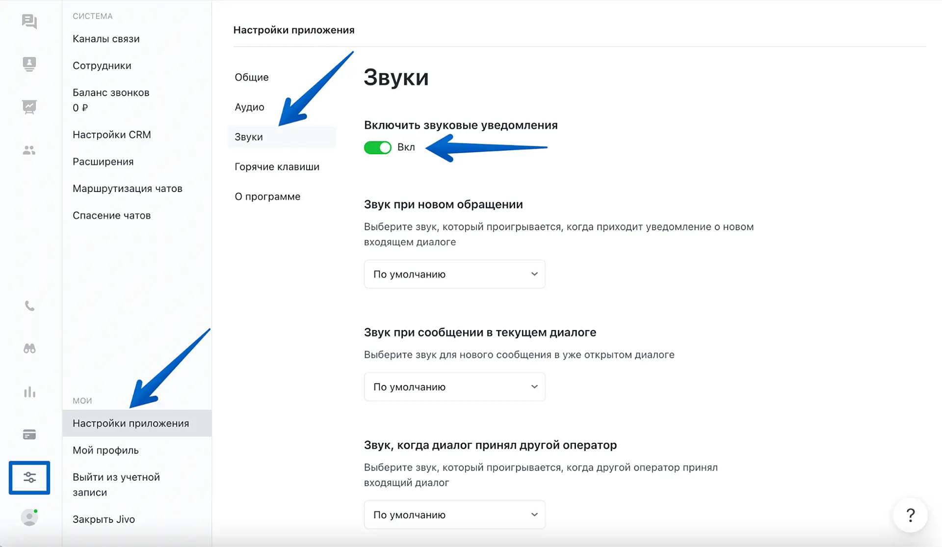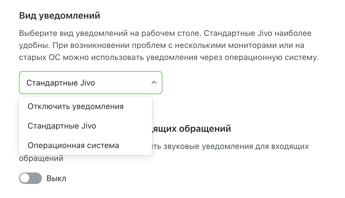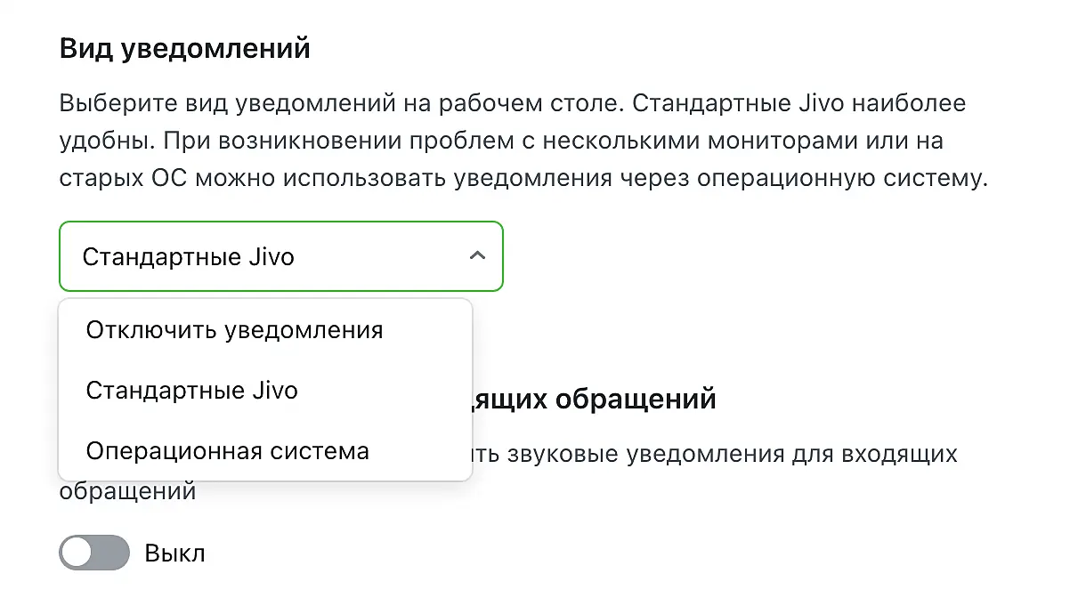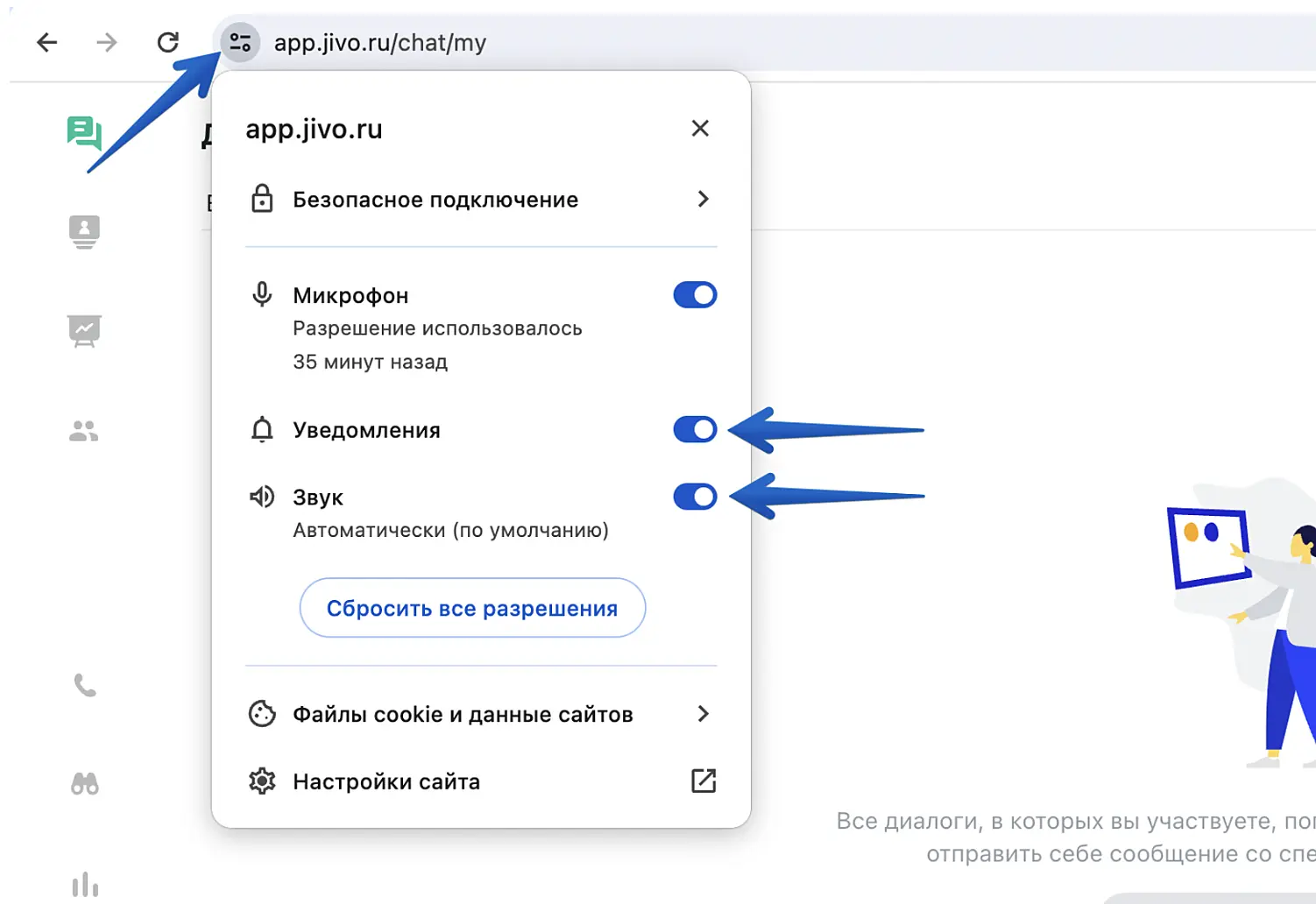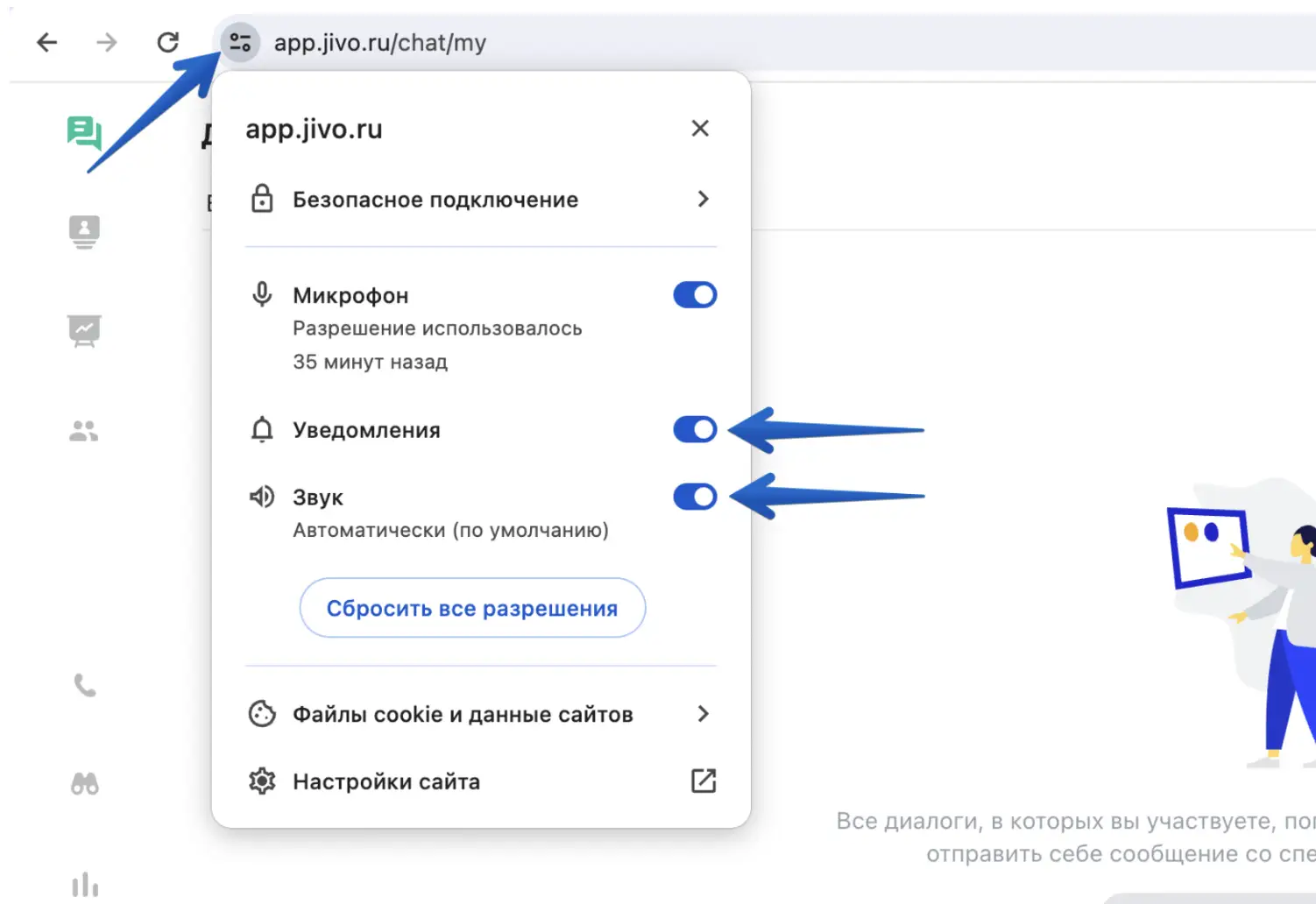 Если уведомления включены, но не приходят или приходят без звука, предоставьте Jivo разрешения в вашем браузере для "Уведомления" и "Звуки".