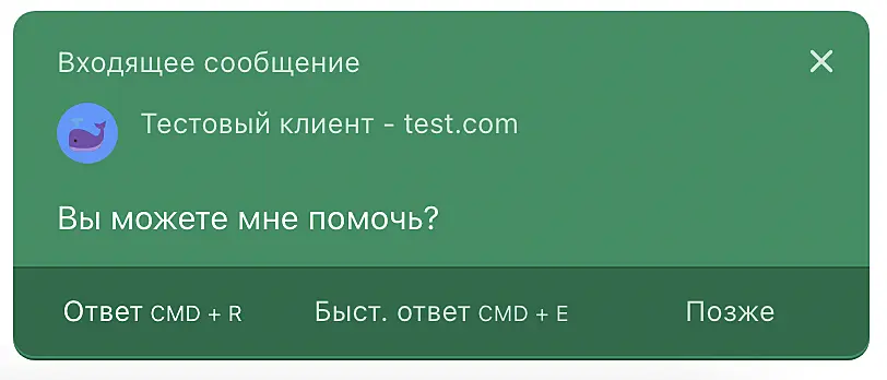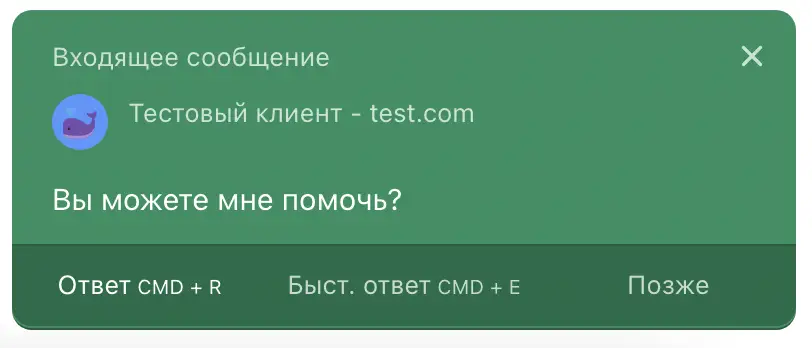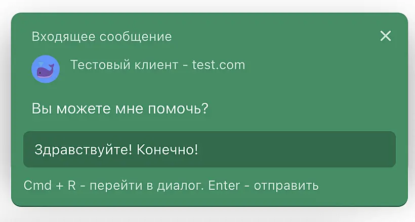 Быстрый ответ. Нажатие на кнопку откроет строку ввода текста для отправки ответа клиенту без необходимости перехода к приложению.