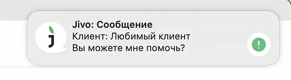 Стандартное уведомление Jivo появляется в правом нижнем углу экрана. В уведомлении отражена информация о клиенте, канале связи и текст сообщения.