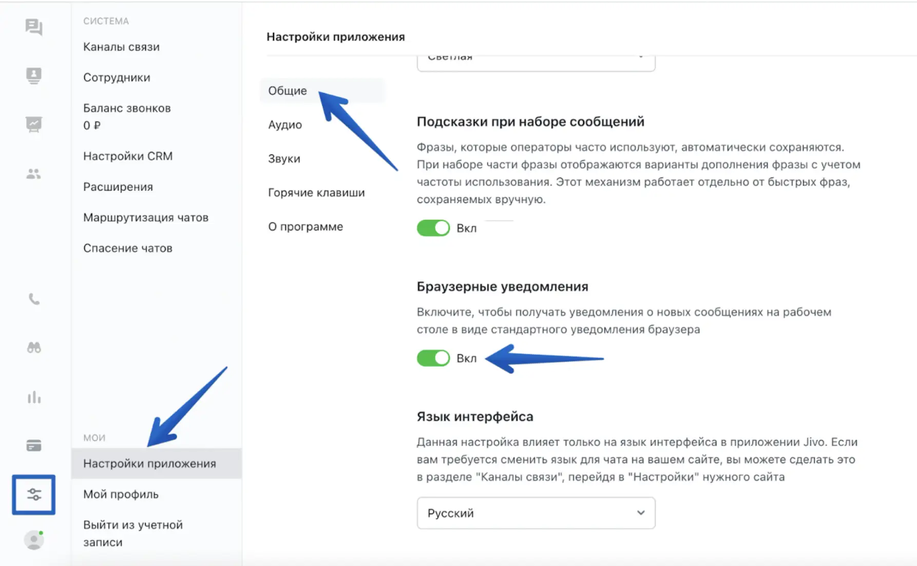 Если вы работаете через веб-версию, уведомления можно включить также в "Управление" > "Настройки приложения" > "Общие" - "Браузерные уведомления".