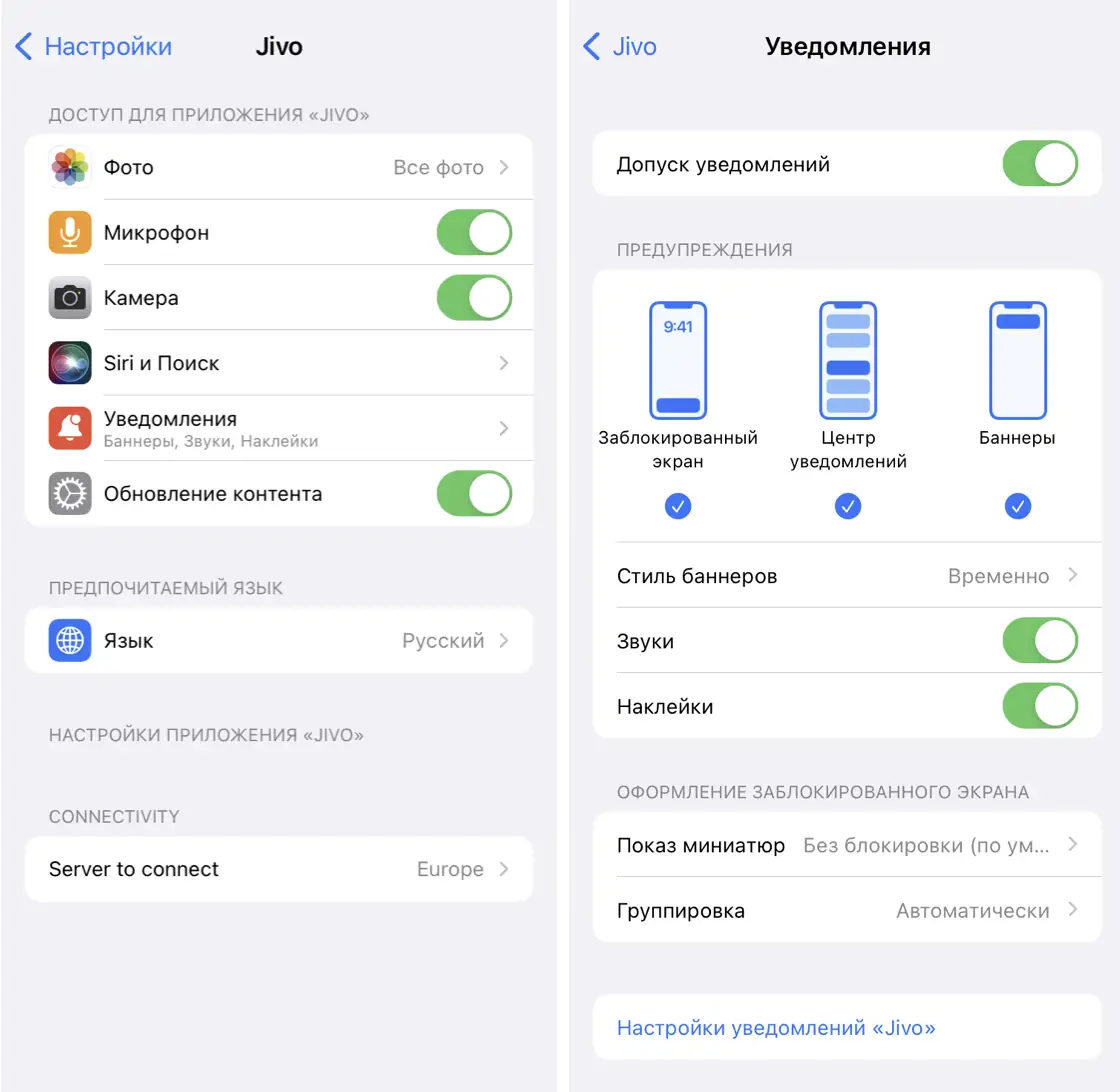 - Проверьте уведомления для приложений Jivo и Google Play Services: Настройки -> Приложения -> Jivo/Google Play Services -> Включить уведомления - должна стоять галочка.