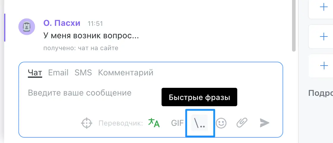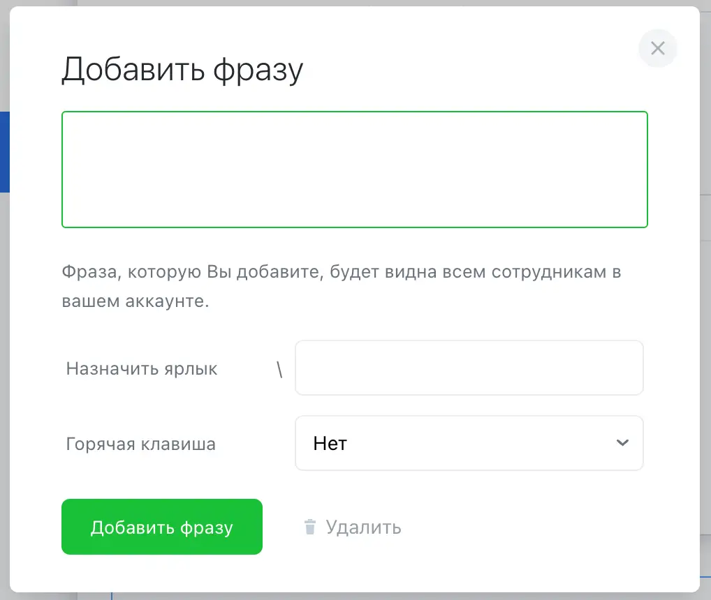 Чтобы добавить новую быструю фразу, нажмите на кнопку "Добавить фразу":