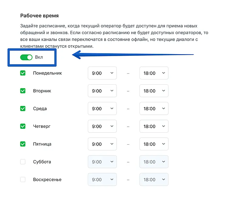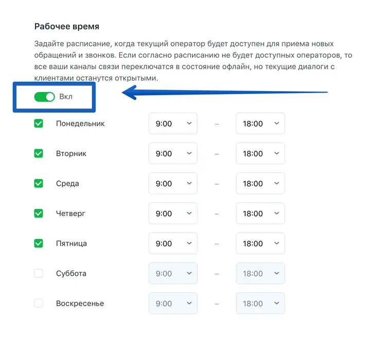 Чтобы ни одно обращение не осталось пропущенным, настройте для операторов рабочее время.