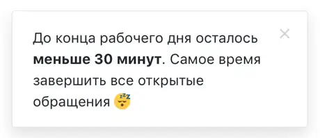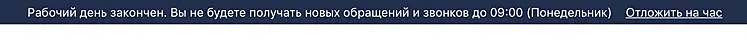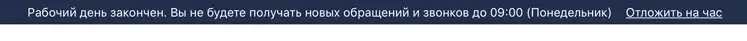 Рабочее время настраивается для каждого сотрудника в отдельности. Если у всех операторов закончится рабочий день, чат на сайте переключится в офлайн-режим. При этом, так же, как и в статусе "Перерыв", диалоги на вкладке "Мои" останутся активными.