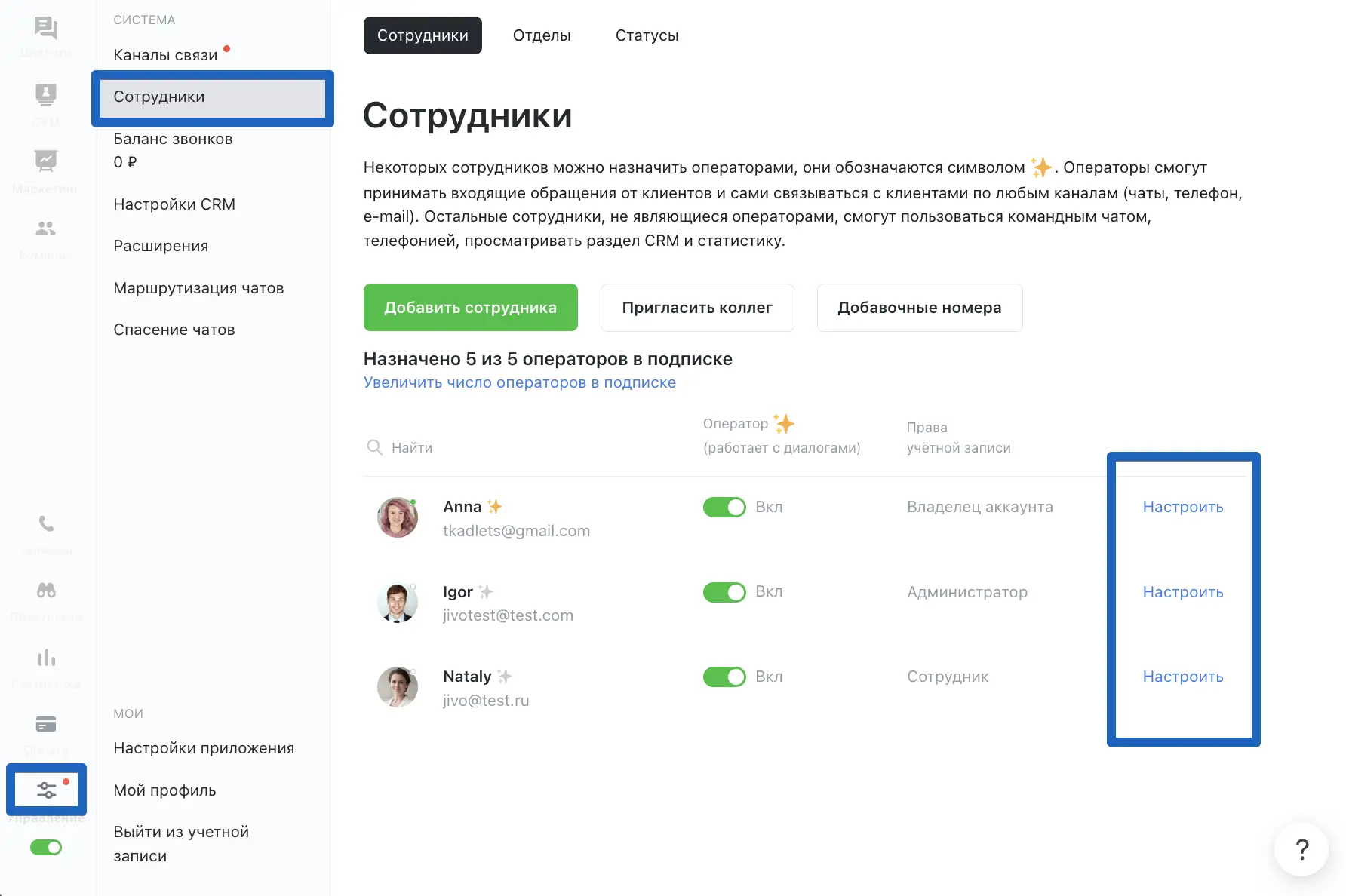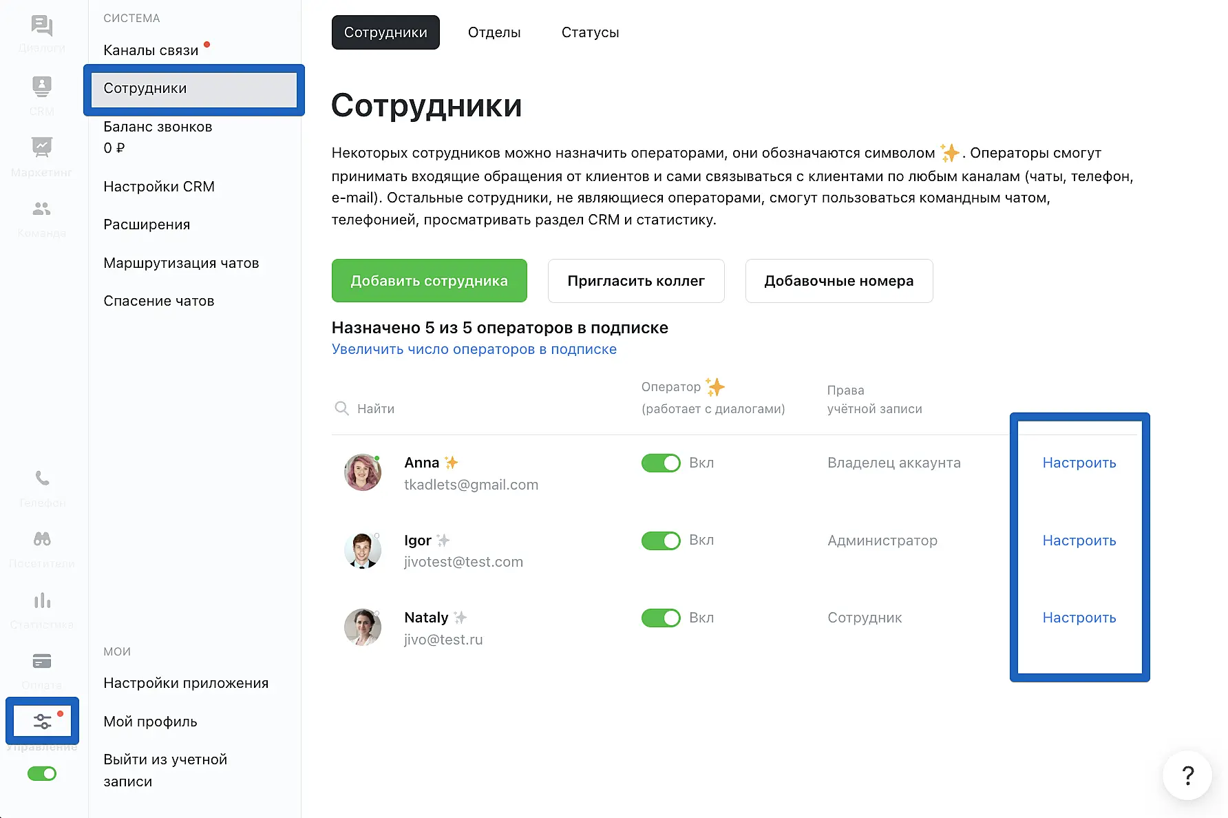 Чтобы настроить рабочее время, в приложении Jivo перейдите в раздел "Управление > «Сотрудники» и нажмите "Настроить" напротив нужного оператора.