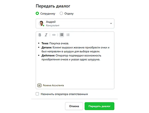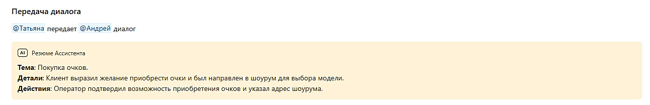 Резюме при передаче диалога — Собирает контекст переписки при передаче диалога другому оператору, чтобы он мог быстрее помочь клиенту.