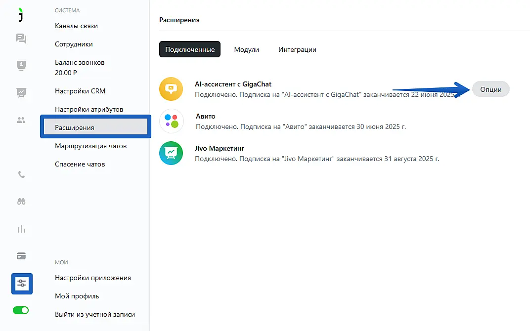 Чтобы включить ассистента, в приложении Jivo перейдите в раздел "Управление" > "Расширения" > "Подключенные" > "Опции" справа от "ИИ-ассистент с GigaChat".