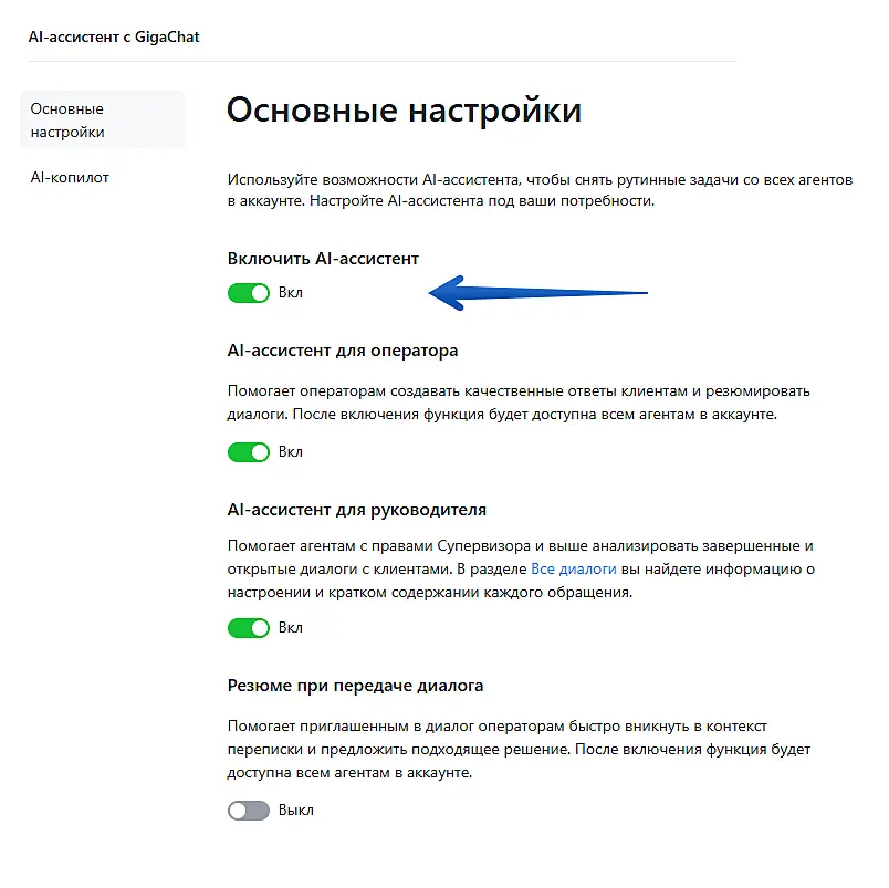 ИИ-копилот доступен для всех операторов. Для разных каналов и отделов можно использовать разные навыки.
