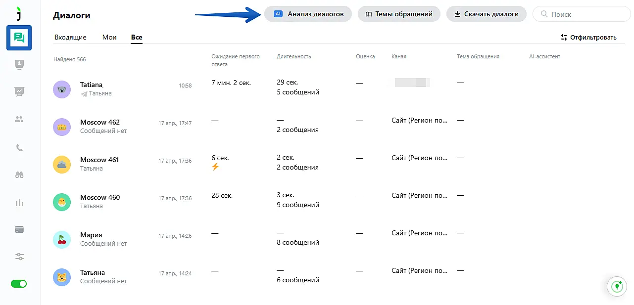Чтобы бот начал анализ, зайдите в раздел "Диалоги" > "Все". Вы можете отфильтровать диалоги по оператору, дате или каналу связи, нажав "Отфильтровать". Могут быть проанализированы как свежие диалоги, так и те, которые были до подключения ассистента.