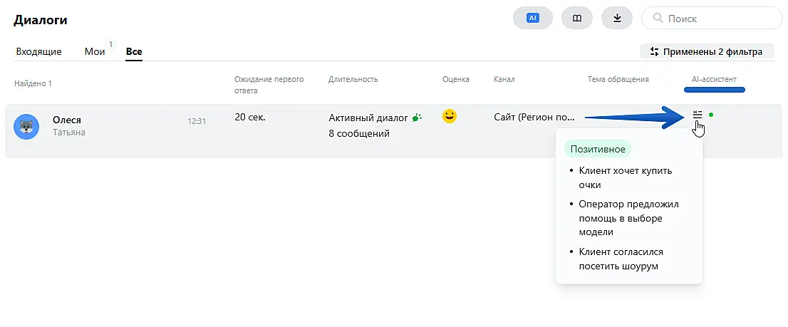 Потребуется некоторое время на анализ. После чего в столбце "ИИ-ассистент" появится соответствующая иконка. При наведении на нее вы увидите резюме диалога и настроение клиента: Нейтральное, Позитивное или Негативное.