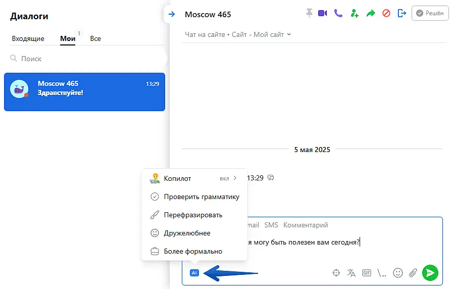 Обратите внимание: Копилот генерирует ответы только в активном диалоге — том, который открыт у оператора в данный момент.