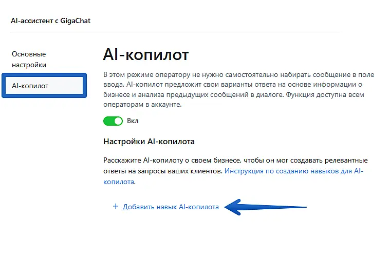 Для этого в настройках ассистента выберите раздел "ИИ-копилот" и нажмите "Добавить навык ИИ-копилота"