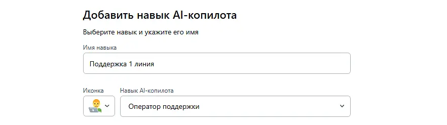 Навык ИИ-копилота — выберите из списка роль, которая наиболее подходит для ваших операторов. Она повлияет на дополнительные знания копилота и стиль общения. На выбор доступно пять ролей: