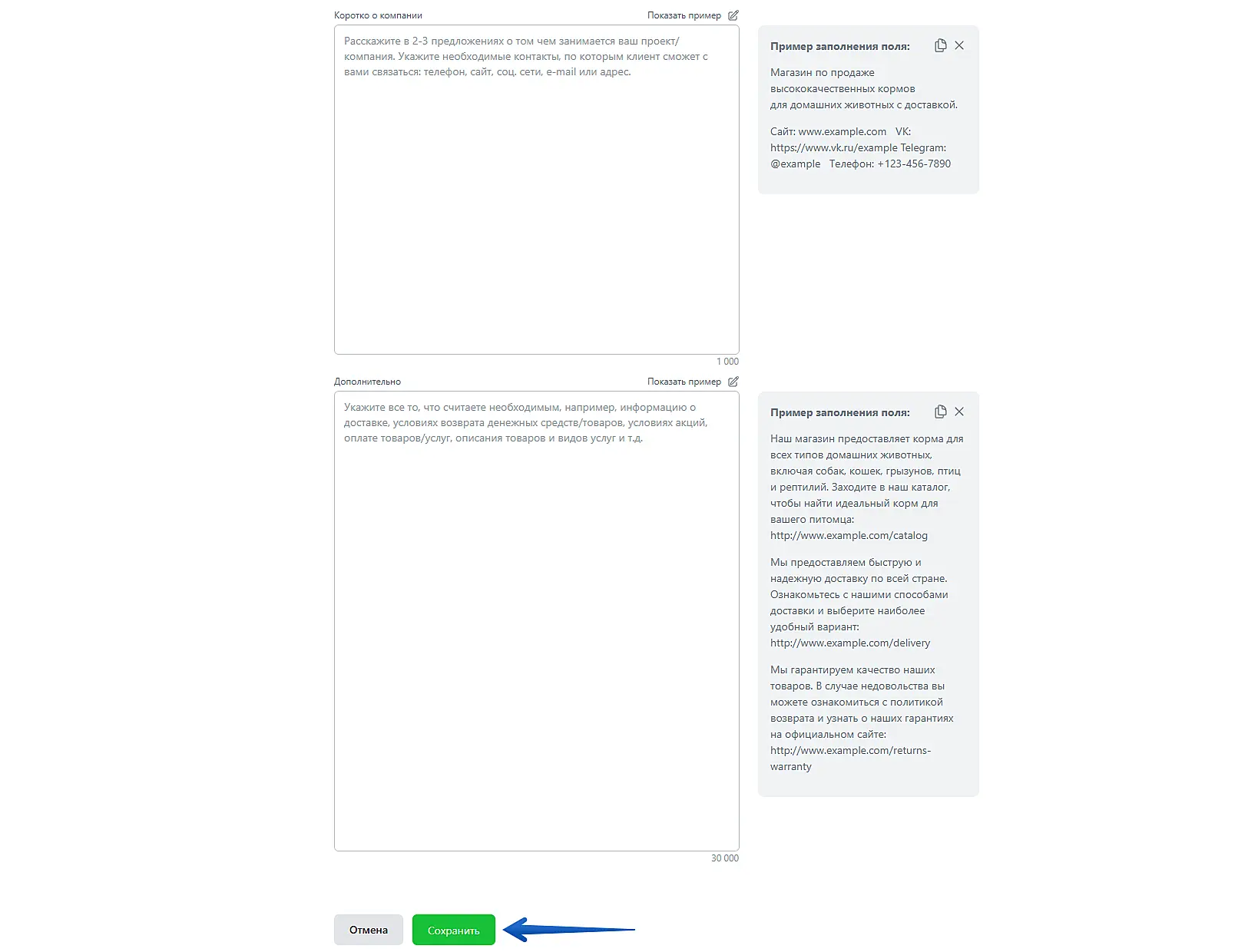 Дополнительно — именно на основе этого поля копилот будет генерировать ответы. Укажите все то, что считаете необходимым: информацию о доставке, акциях, возврате, оплате товаров и пр. Максимальный размер — 30 000 символов.