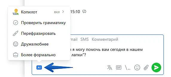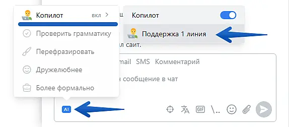 Для того чтобы ассистент начал генерировать ответ в чате, нажмите на иконку "AI" в окне диалога, включите "Копилот" и выберите нужный навык.