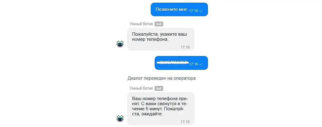 - "Если клиент указывает номер телефона и просит позвонить, сразу же переводи диалог на оператора".
