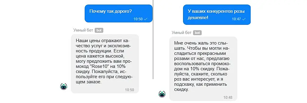 - "Если клиент жалуется на цены - предложи ему промокод "Rose10" на 10% скидку."