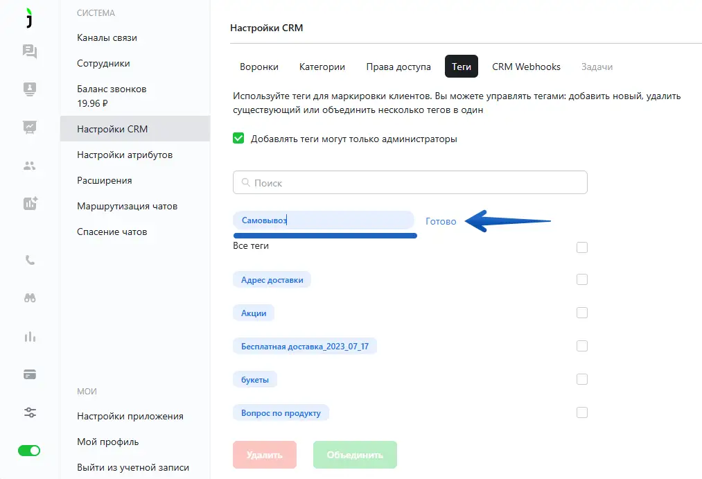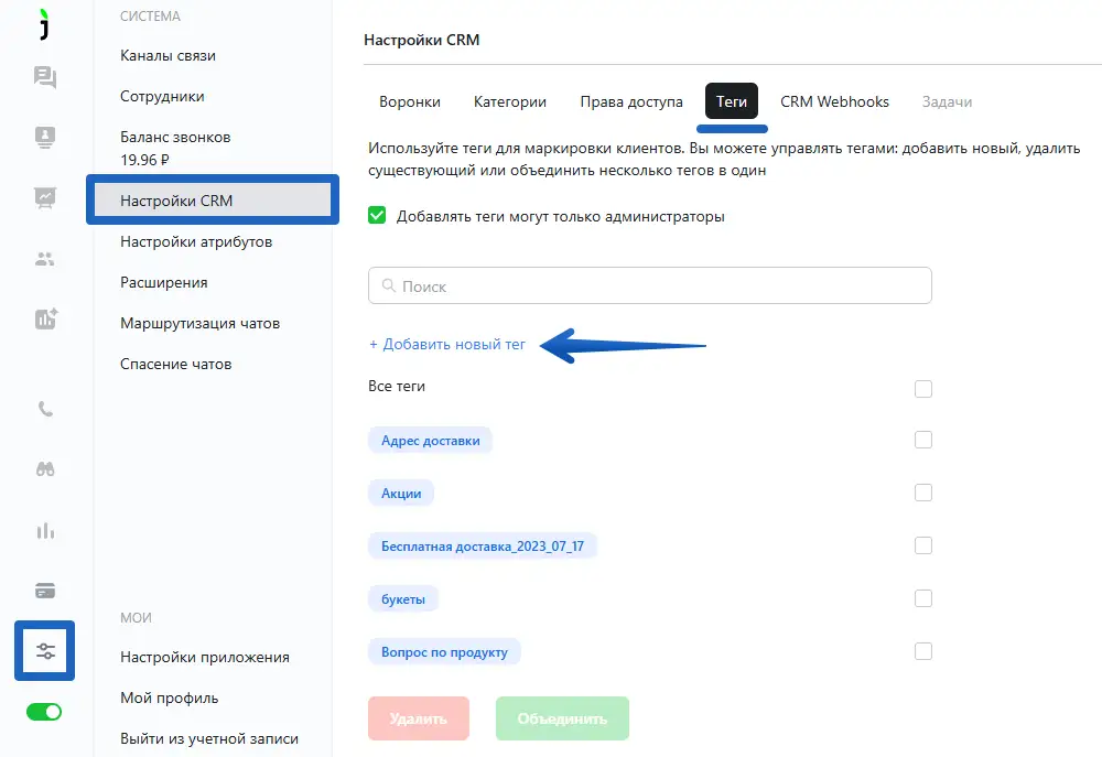 Созданные теги будут отображаться в разделе "Управление" > "Настройки CRM" > "Теги", где можно будет изменить их названия или удалить.
