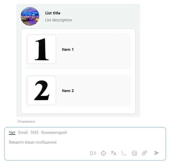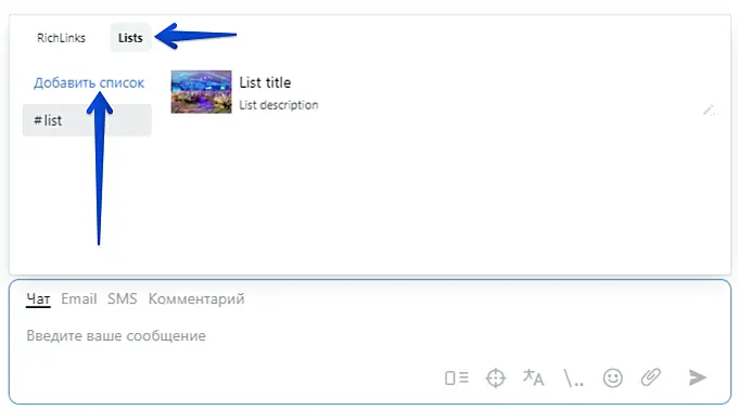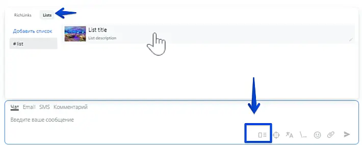 После создания Списка, вы можете отправить его клиенту в любой момент во время диалога. Достаточно нажать на соответствующий значок под полем ввода сообщения в окне чата и выбрать нужный Список в меню Lists.