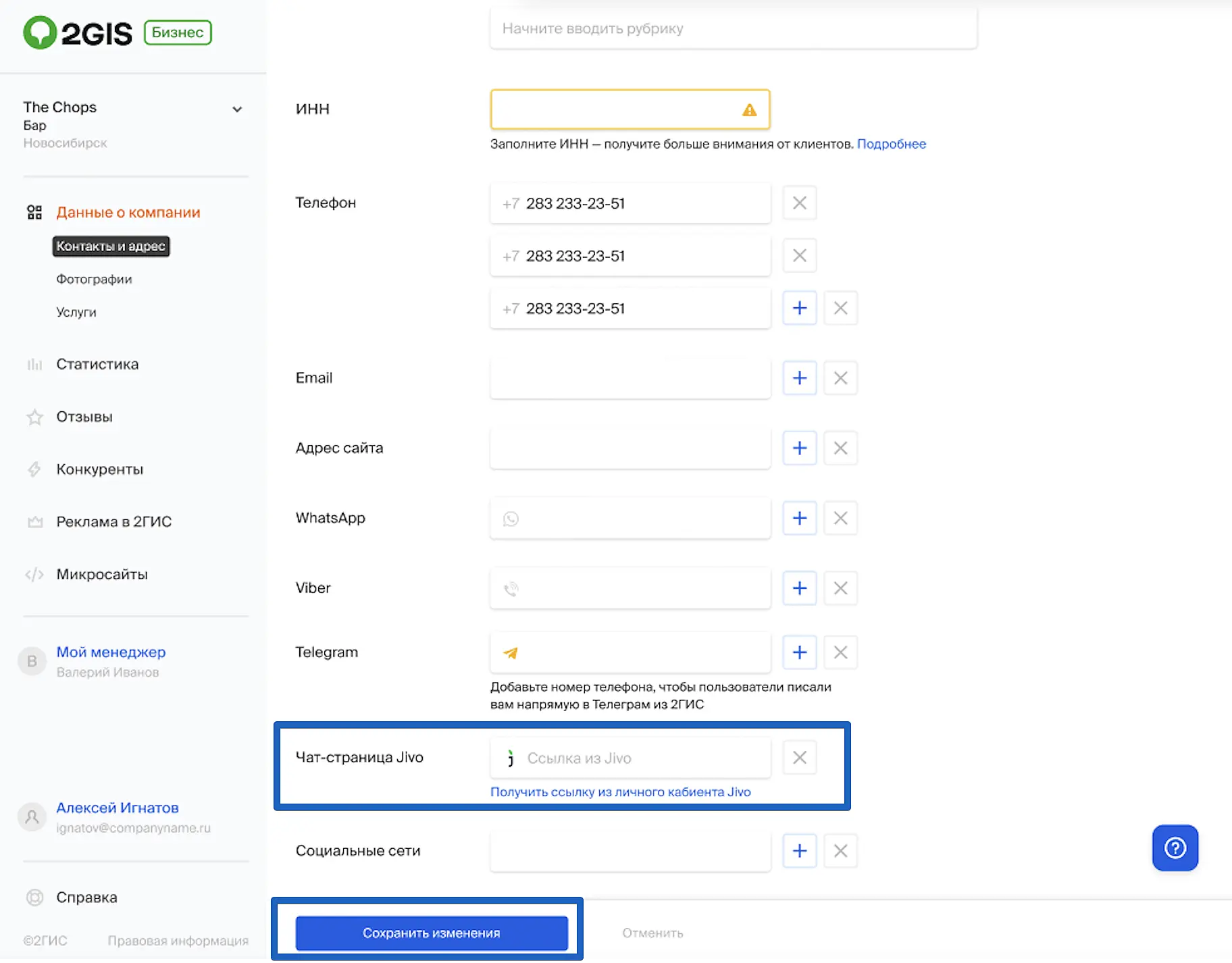 После входа в аккаунт, перейдите в раздел "Данные о компании" > "Контакты и адрес":