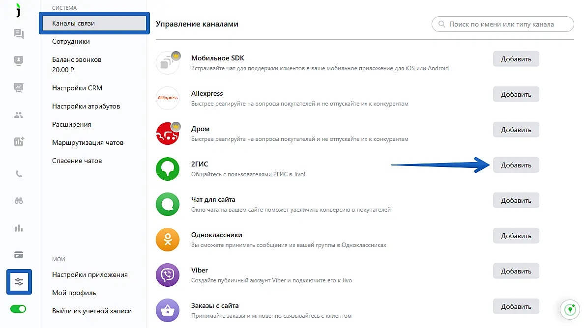 Для начала добавьте канал 2ГИС в приложении Jivo: выберите раздел "Управление" > "Каналы связи". Нажмите "Добавить" справа от канала "2ГИС".
