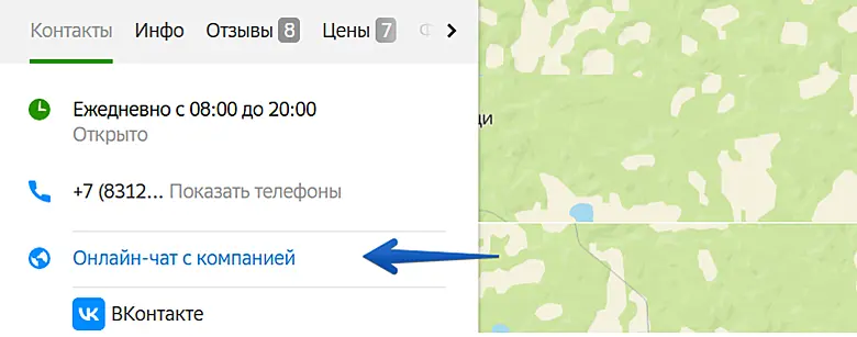 После того, как модерация будет пройдена, пользователь увидит кнопку "Онлайн-чат с компанией" в разделе "Контакты" в 2ГИС. При нажатии на нее откроется чат-страница с вашими операторами из Jivo.
