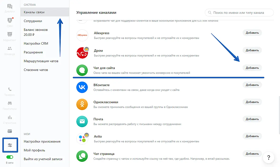 В разделе "Добавьте новые каналы" найдите пункт "Чат для сайта" и нажмите "Добавить".