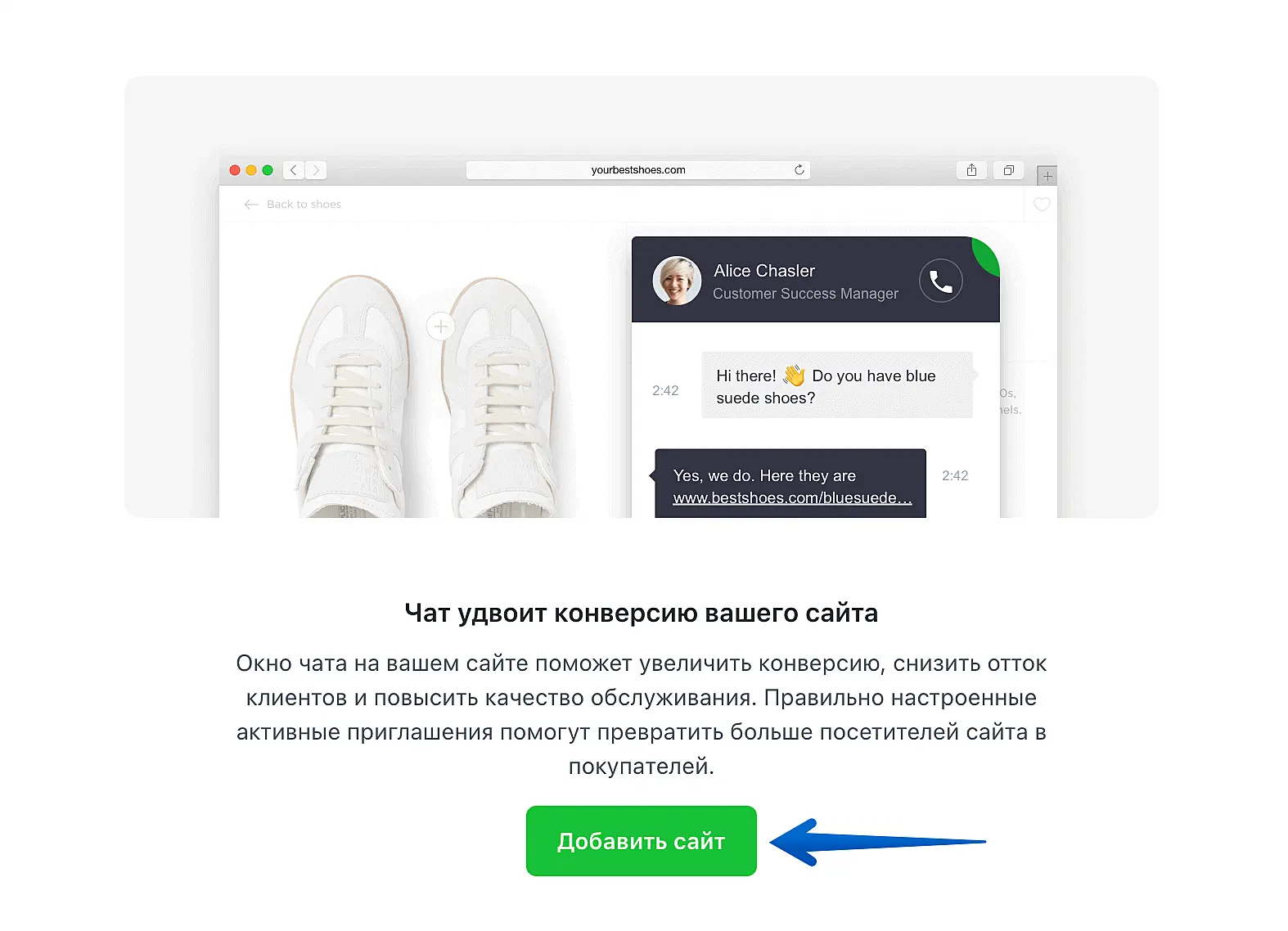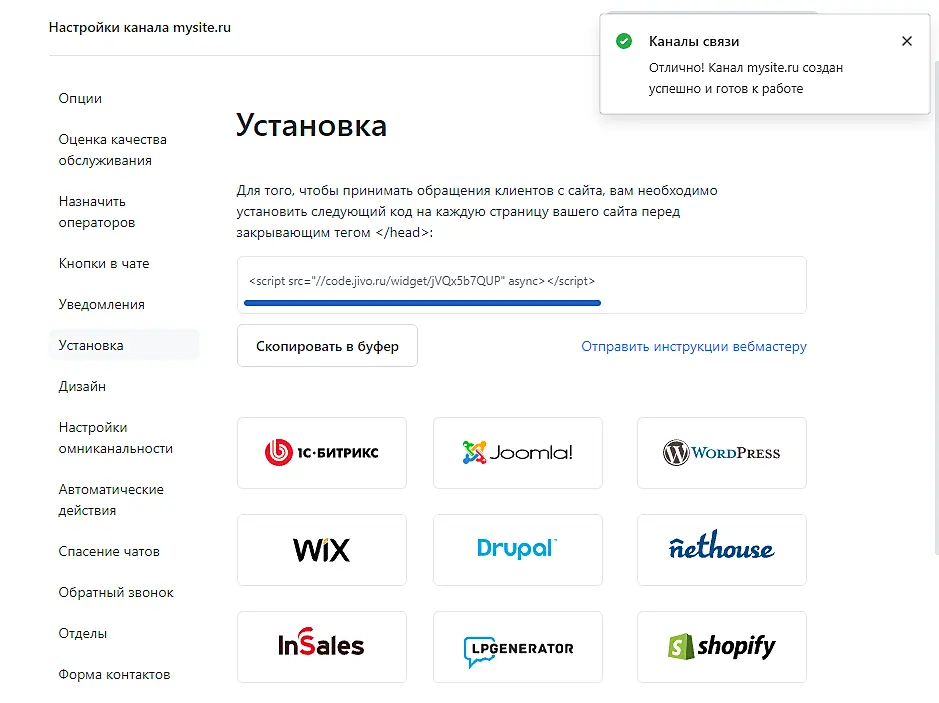 После добавления сайта система предложит вам скопировать сгенерированный код чата для установки.