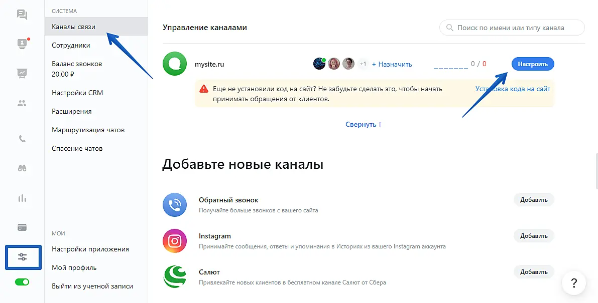 Для этого пройдите в приложении Jivo в настройки канала в раздел "Управление" > "Каналы связи" > "Настроить"