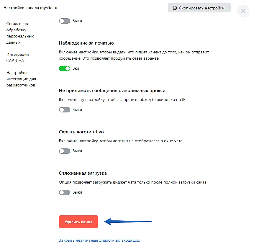 Для удаления сайта в приложении Jivo вам потребуется зайти в настройки нужного сайта: "Управление" > "Каналы связи" > "Настроить" > "Опции".