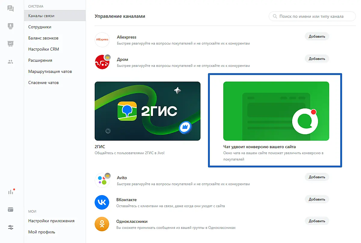 Для добавления еще одного канала "Чат для сайта", зайдите в приложение Jivo, затем выберите "Управление" > "Каналы связи".