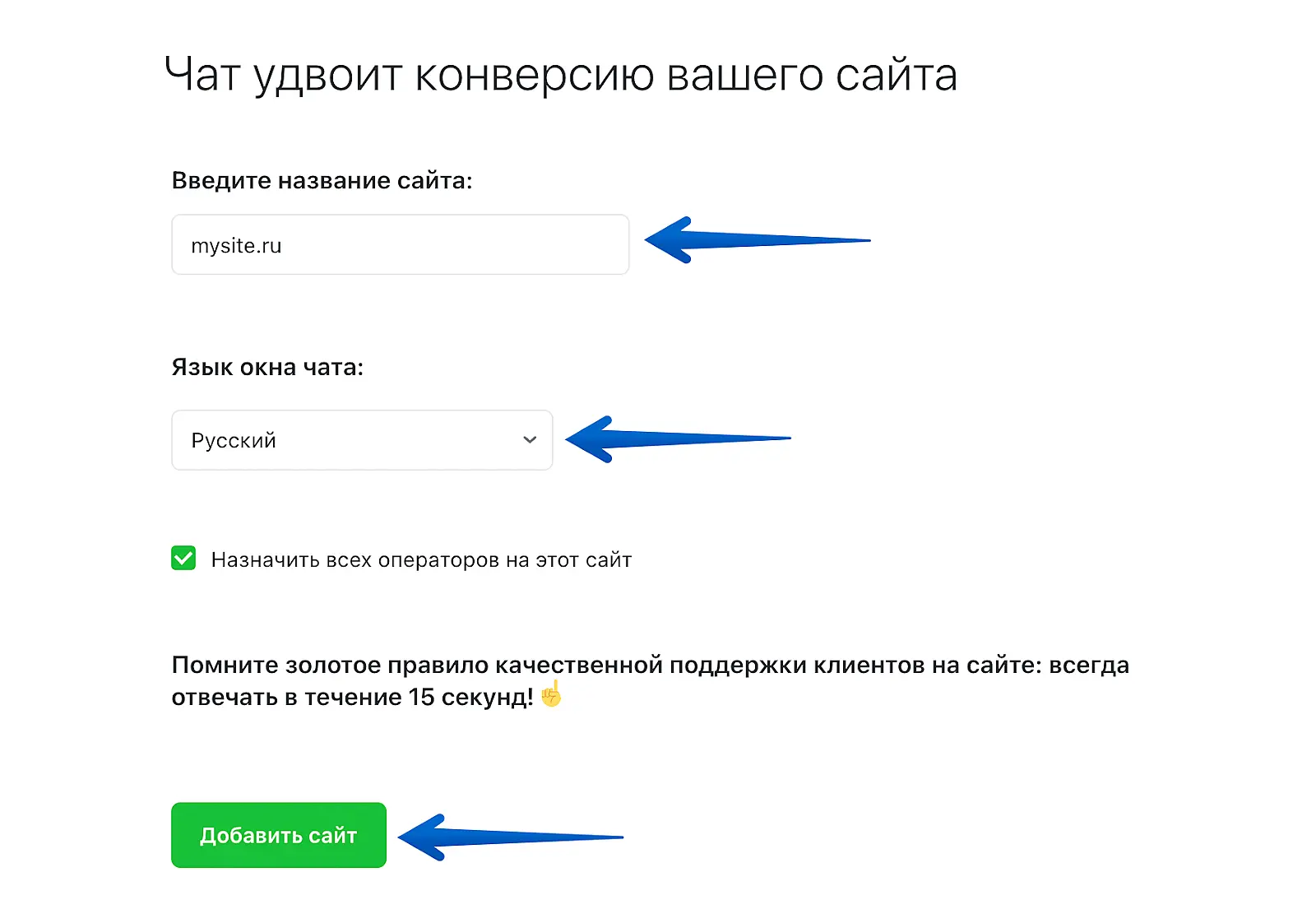 Укажите название вашего сайта и выберите язык, который будет использоваться для чата в дальнейшем.